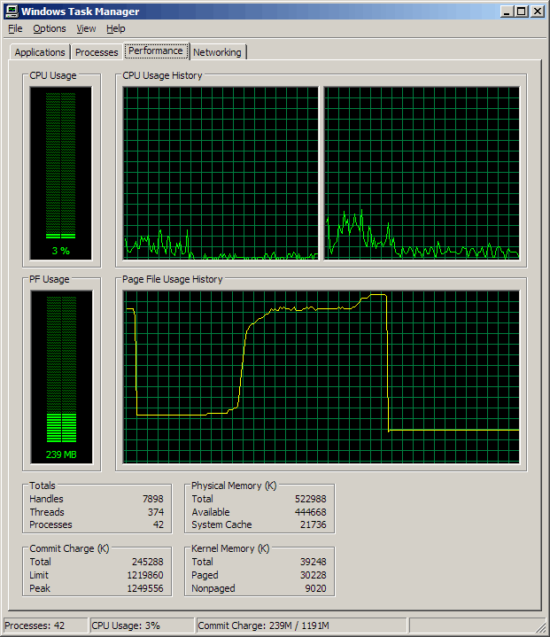 沒做什麼有建設性的事,但就是累得跟狗一樣;為什麼呢?因為做事沒有效率啊。兩個作業就寫了我兩個星期,對OpenGL不熟,對Windows Programming不熟,只會寫console mode程式回台灣就啥都不行了,真是可恥。 寫程式不難,但寫好程式很難。右邊的圖是很好的例子(不是說Task Manager沒寫好,請按大圖看),竟然能夠吃記憶體吃到超過Windows的Virtual Memory不夠,這就是寫程式的人的問題了(←就是我)。