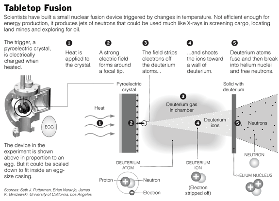 http://www.nytimes.com/2005/04/28/science/28fusion.html (須要加入電子報會員) UCLA物理系的Dr. Seth J. Putterman研發出新種的小型核融合device,基本上是由加熱或冷卻pyroelectrics物質讓它產生磁場,然後帶動原子核相撞,以產生核融合。現在雖然沒有產生能量的可能,但理論上經過改良後,可以變成中子源,讓到處都有X光機(爆)。 不知道鋼蛋裡面那些微型核融合發電機到底怎麼做的,喔,因為有米諾夫斯基粒子啊。至於某SEED的世界的話,靠雷射誘發核融合,可是要造成那麼強力的雷射的能源是啥?不沉戰艦アークエンジェル,妳到底是怎麼得到動力的? 嗯,以上。 | |
