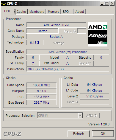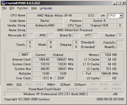 雜談、近況、有的沒的。跟newegg買了兩顆Athlon XP-M 2500+,放了好久都沒有裝起來,結果一裝上去發現有一顆DOA(Dead On Arrival),這實在相當麻煩,還得要寄回去換貨,但在那之前得先RMA啊。花了一整天都在搞這CPU,才確定有一顆壞掉。然後正常那顆因為是Mobile的,所以我的TigerMP直接認定是6x,一開機給我秀個Athlon 800Mhz,但進Windows之後用Crystal CPUID調Multiplier到14x就回到1.866Ghz標準速度這樣。不用搞Bridget mod真好。 ![]()