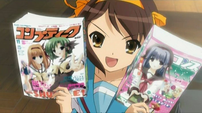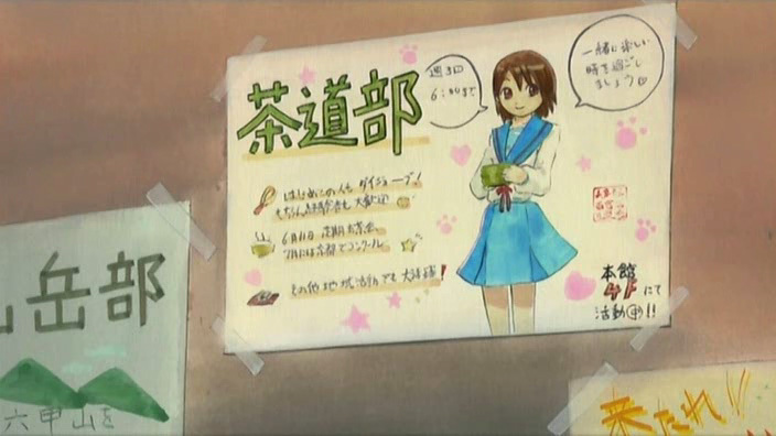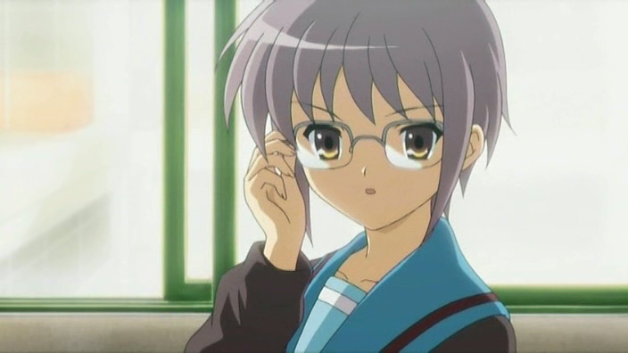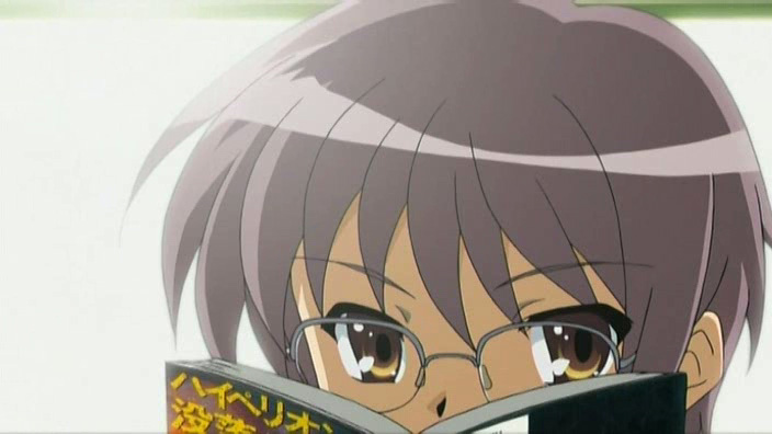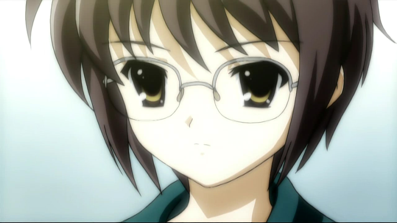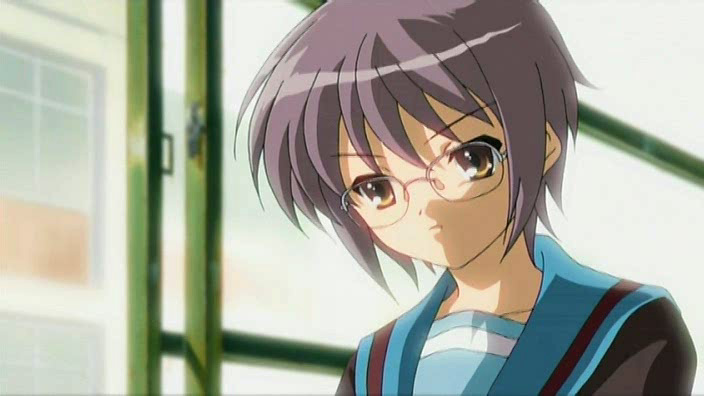 透過中學時的同學講說她怪(ㄟ,那個鮮明的回憶,你不用否認了,一定就是你,假裝是外星人超能力者想要接近涼宮,被發現只是普通人就告吹了這樣),透過男主角的眼睛看著她怪,各個社團都參加,到最後沒有一個參加;換衣服的時候也不管有沒有男生在場,直接就脫了,這段要說不是サービス我實在不信,但反正沒有秀出小褲褲,就一切ok,日本電視真怪。 而男主角當然是那個打開涼宮心房的幸運(?)兒,也讓大家知道,她會怪的原因就只是因為她覺得這個世界平凡得太無聊了。每個社團都去體驗也是想要得到比較「不一樣」、「不無聊」的體驗罷了,其實到這裡,就一點都不覺得怪了。 然後因為主角亂講話,讓涼宮ハルヒ想到成立社團這樣。而社團的要素,社辦和社員,結果就是搶了只剩長門有希一人的文藝部的部室,再拐了朝比奈みくる來當社員,呼呼。不過,剪頭髮之後是不是就不換髮型,也不隨著曜日換髮飾了啊,有點可惜,不過要一直變的話,這對角色設定的負擔太重的,所以固定下來也比較好就是了。反正應該還有其它的配件,所以就是這樣把造型定下來了。 嗯,不過,這段可以看得出來,像涼宮ハルヒ這樣,會提出萌え理論的女高中生,世界上是不存在的;就算存在,也不會長這麼可愛的,嗯嗯。不過揉著みくる胸部那段實在太有趣了,哈哈哈哈。果然是マスコットキャラみくる啊。 而SOS団到底是什麼呢,嗯,「世界を大いに盛り上げるための涼宮ハルヒの団」,嗯,我笑了。 以上是本週的涼宮ハルヒ,再來是配角們,首先是マスコットキャラ「朝比奈みくる」。 然後是長門有希,本集是眼鏡娘! 這集比上一集電影裡面的可愛多了,果然我對眼鏡娘沒有抵抗力啊。 再來,是號稱一年級前三名的美人,應該是班長的朝倉涼子這樣。 嗯,這個角色,怎麼講,很像是頭髮加長之後的鷺ノ宮藍ちゃん啊啊啊啊!為什麼不找静木亜美來配呢!沒關係,反正不是主角,所以也沒關係。 以上是故事內容的部份。至於為什麼上面會說要等BD呢,很簡單,這部的作畫水準,還有有些畫面的細微動作,肯定是以HDTV放送為前提而做的,但是明顯的本季地上波放送沒有辦法做到HDTV放送,所以被down sample到SD解析度再送出來這樣。希望之後會有HDTV放送重播,不然就只有等BD版了。
