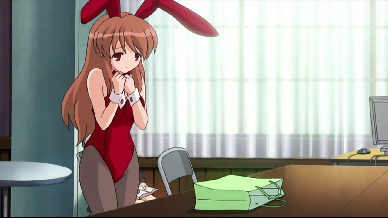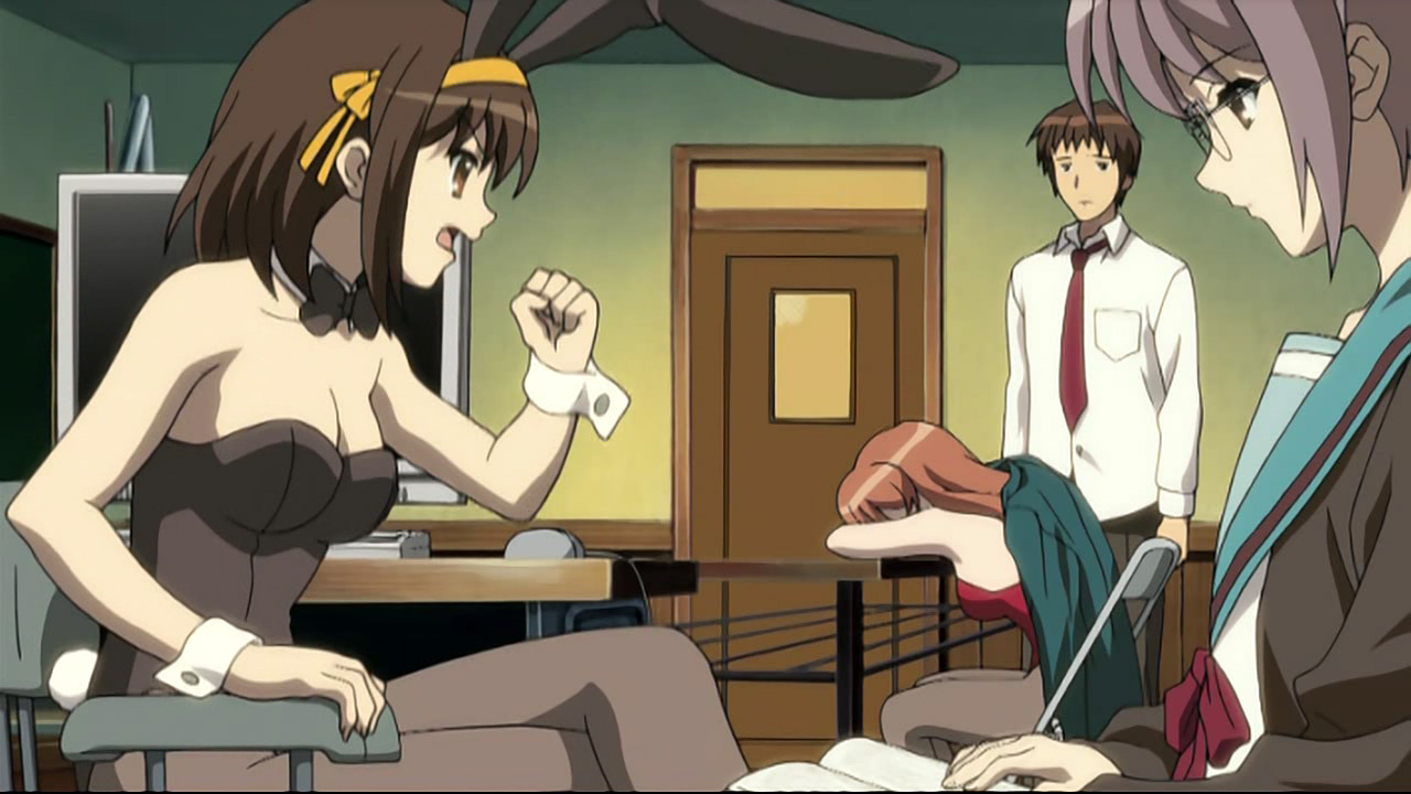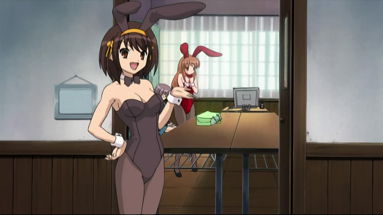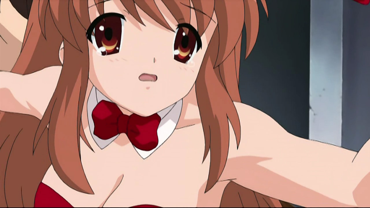 這集,應該是「みくるちゃんの悲劇」吧... (默) 一開始就用正常的女性來比對涼宮ハルヒ的不凡,然後再用兩件みくるちゃん悲劇增加ハルヒ的相對不正常程度這樣。 首先,パソコン調達行動,就結果論,沒吃上官司真是相當幸運,而可憐的電研社,只有社長享受到みくるちゃん的巨乳,然後就要賠上一台新電腦,外加施工費,還有軟體,天啊。 不過,みくるちゃん可憐歸可憐,這樣反而會讓人覺得萌え啊(爆)。那句「不束者ですが、これからもよろしく」實在是... 小弟快被擊墜了這樣 XD 再來是第二個悲劇,穿兔女郎裝校門發傳單。怎麼說,這邊的教訓就是不要輕易相信人,也不要輕易做出無法達成的承諾。快樂的ハルヒ很可愛,被強制穿上兔女郎服的みくる也很可愛,不過這還是悲劇啊。