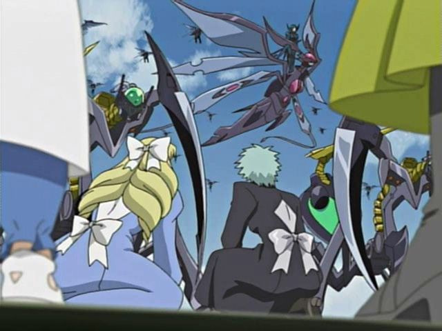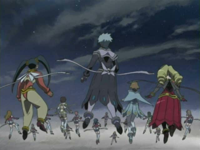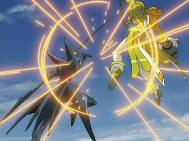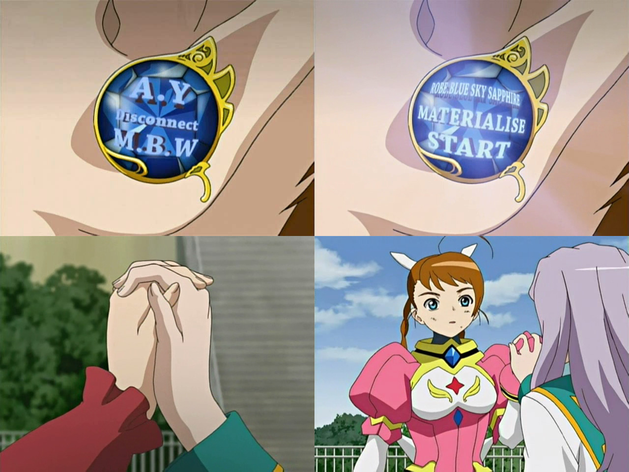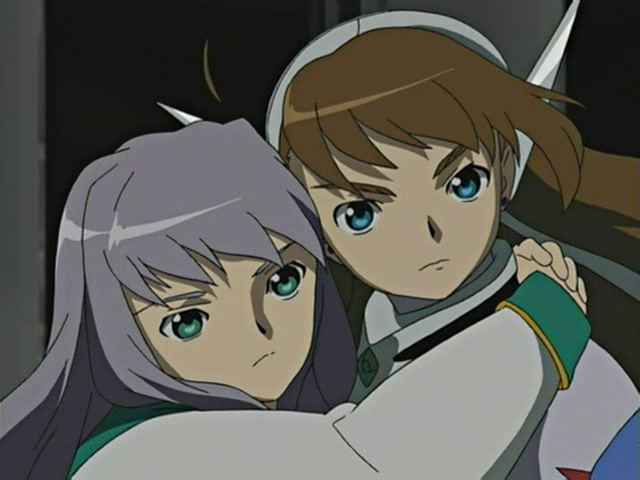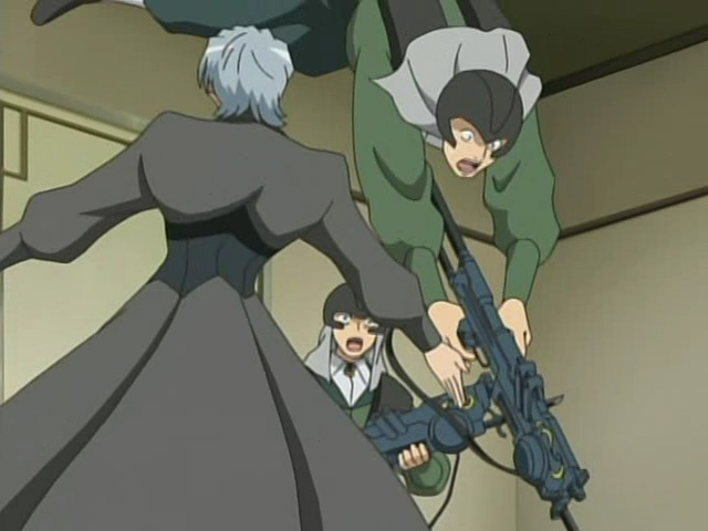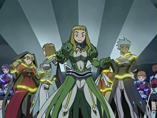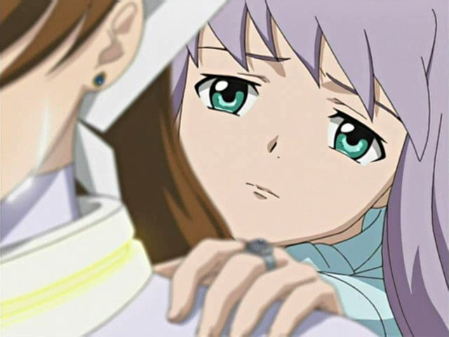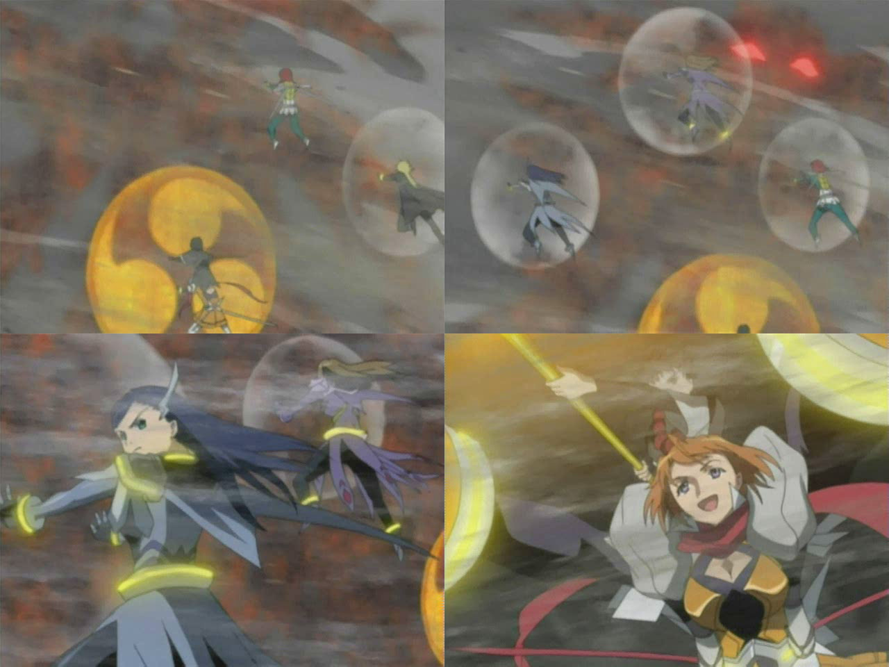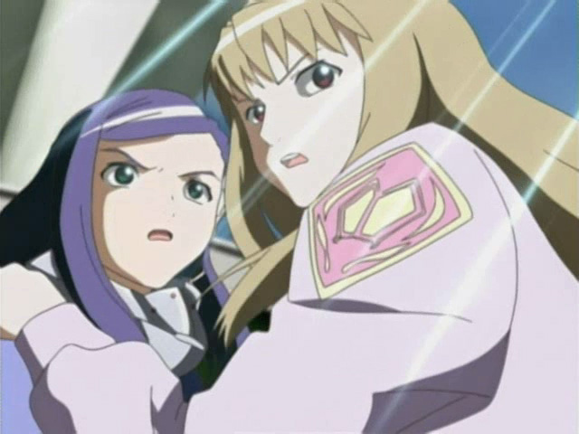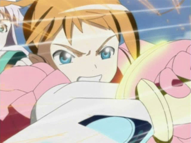 所以,基本上目的就是透過「物理」的,「有線」的和真祖接觸達成可以Materialize狀態,然後用ナツキ的陽電子炮(就說不是了)把對方的真祖給轟掉這樣。但相當可惜的是,跟EVA一樣,第一發一定都打不中。而比EVA慘的是,沒有第二發的機會啦。眼看著就要直擊的時候,當然就是正義夥伴登場的時候了。這次登場的則是フリーダム…不對,ユメミヤアリカ!靠著力量沒有全開的「蒼天の青玉」,還是把敵人的陽電子炮給彈回去啦! 這段的演出真是相當煽情,被某Seed D影響的嗎?應該這兩集有很多地方,アリカ跟キラ大神沒兩樣(汗),果然是Sunrise的台柱這樣。 對上田中トモエ之後,アリカ和マシロ様分別展開說服作戰,應該是多少有影響到正常的マイスター啦。 不過壞人怎麼可能這麼輕易的就放過這些オトメ呢?或者說,怎麼可能因為主角登場而手軟呢?這樣就不像是Sunrise社的壞人啦。所以更邪惡的計畫就開始啦,管它同不同盟,只要是オトメ就全部把她們能力給消掉,只剩下自己這邊有這種能力。所以就是再用真祖加強干擾功率,直接讓遠距離認證失效這樣。兩位本來在「壞人」那邊的マイスター就這樣輕鬆的被背叛了。 至於救了アリカ的チエ,號稱是因為シホ的まきまき讓她能夠脫離真祖控制,這實在很怪。まきまき真的有效嗎?(汗)不管怎樣,シホ也算是用正義夥伴的身份登場了,後面兩位跟著まきまき的リリエ和ヤヨイ,辛苦了。 但只有まきまき是沒有辦法止住田中トモエ的怨念的。所以要有更強力的正義夥伴登場才行,而這就是ミドリちゃん登場的時候啦!經過ヨウコ調校之後運作時間變成無限制的REM,讓ミドリ的戰力跟オトメ完全沒有差別啦!這才是真正的正義夥伴! 但敵人實在太多了,別的オトメ都沒力的話,只靠ミドリ也沒辦法去破壞掉壞人的真祖,只有靠著主人和オトメ能夠物理接觸的アリカ和マシロ様直接殺過去這樣。 再來是這集讓我差點流淚的一段,アリカ和レナさま的這段。尤其是アリカ秀著她還不完全的マイスターローブ那段。