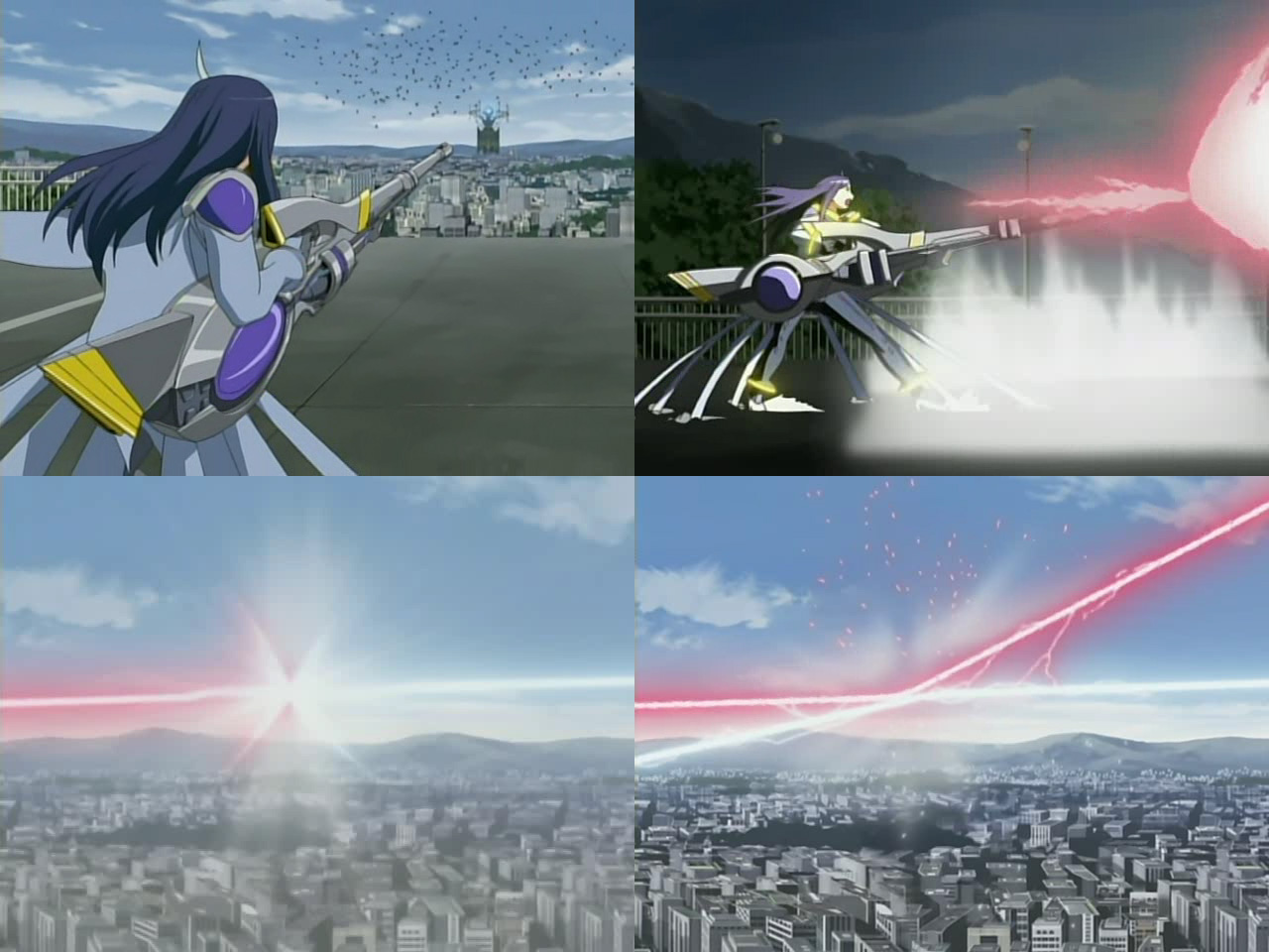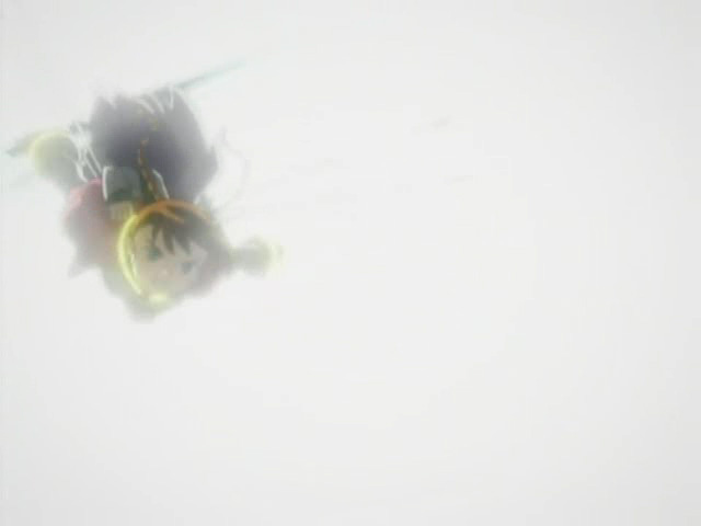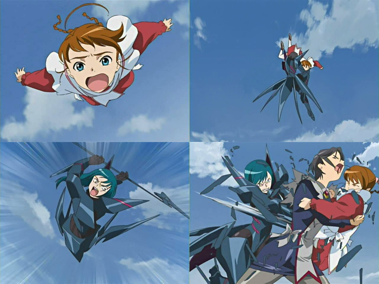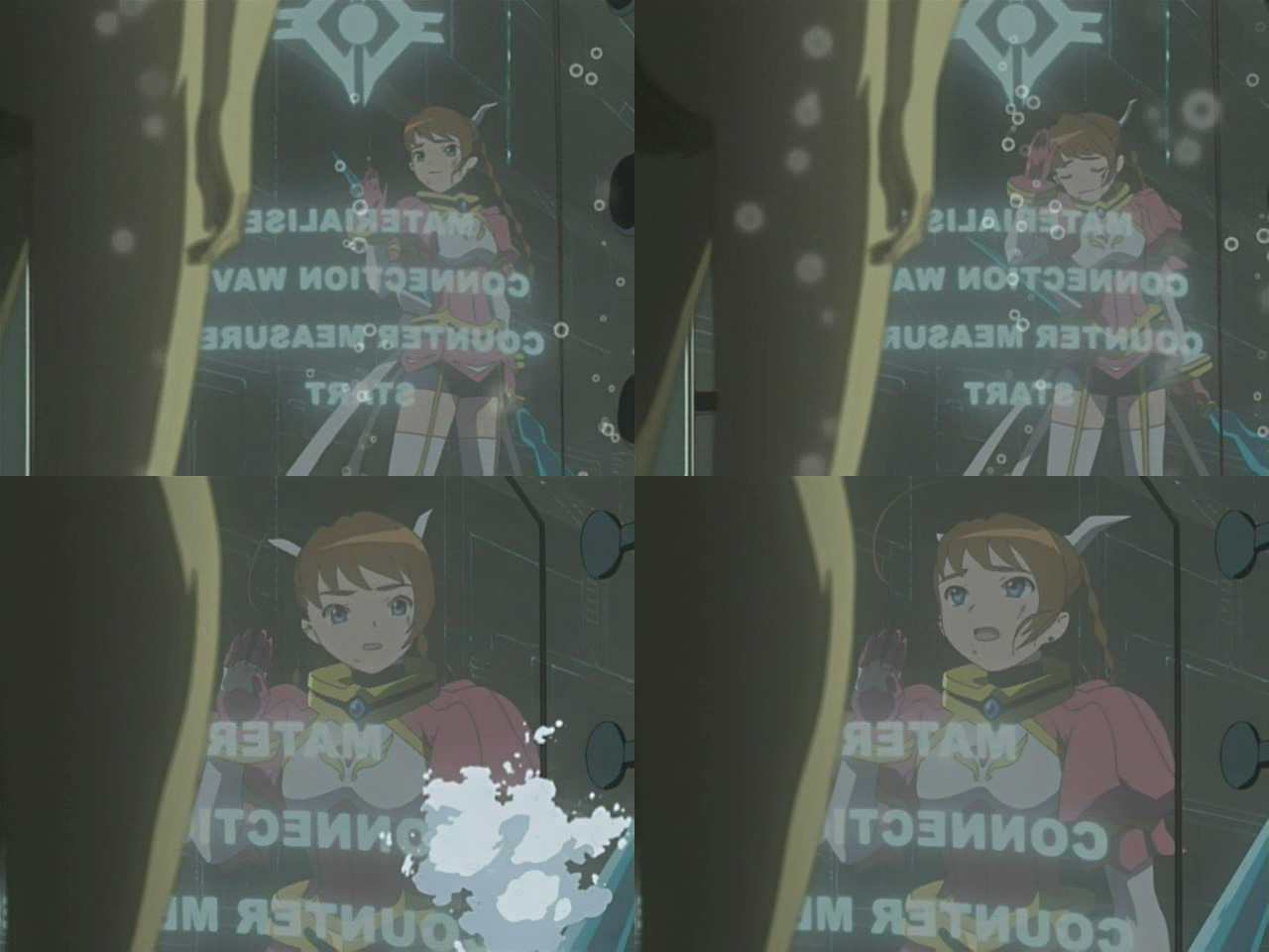 再來這邊很怪。那個光束應該是之後ナツキ被彈掉的那一擊吧?所以其實這是把ミユ潛水這段先往前放,然後再往前跳回發射陽電子炮(應該不是啦)的那段繼續演出?不管怎樣,更怪的是為啥水裡面竟然是風華學園?不是說人類是從其它星球移居到惑星エアル的嗎?那怎麼在水底會有風華學園?還有オーファン耶。