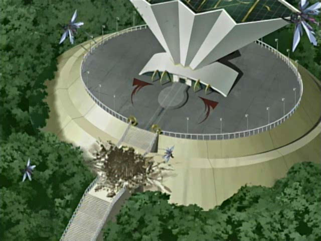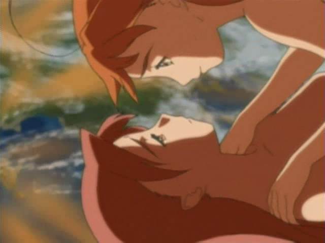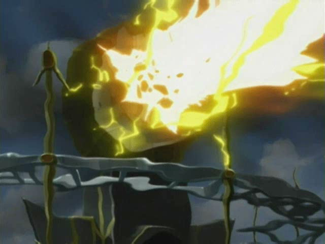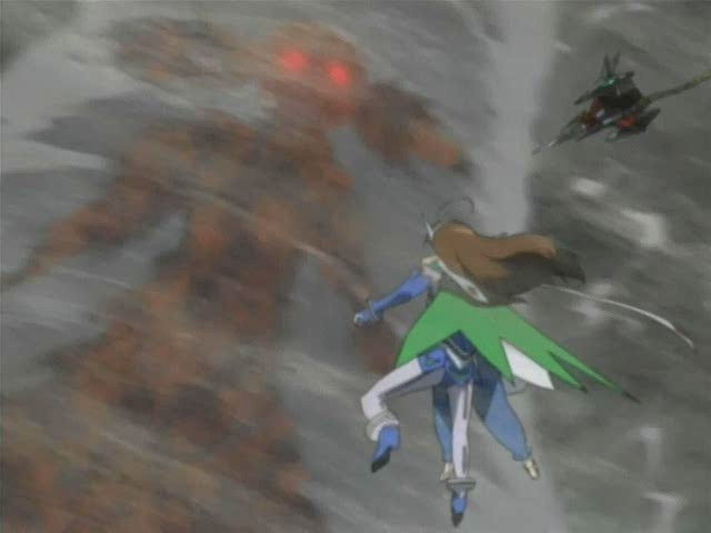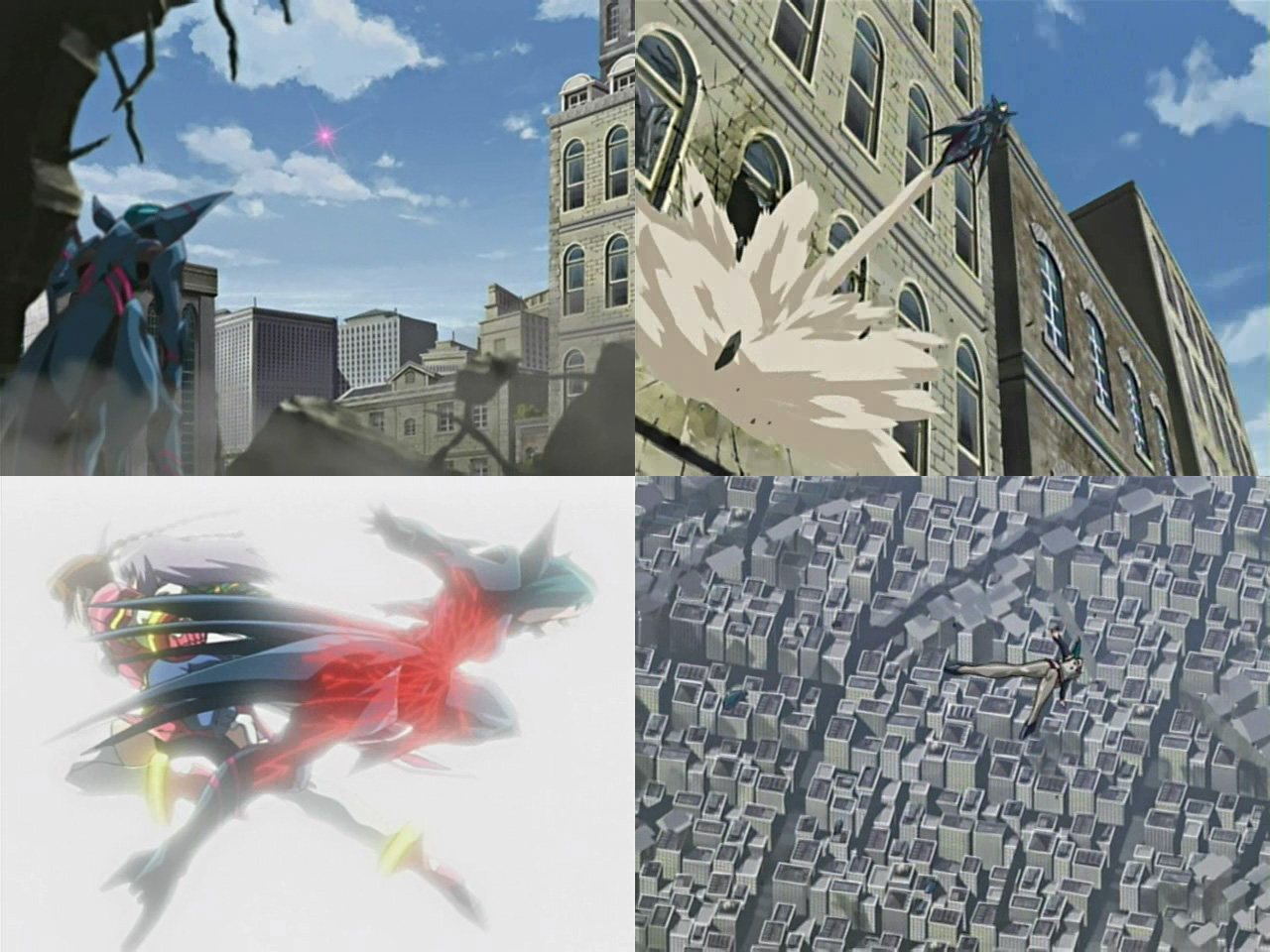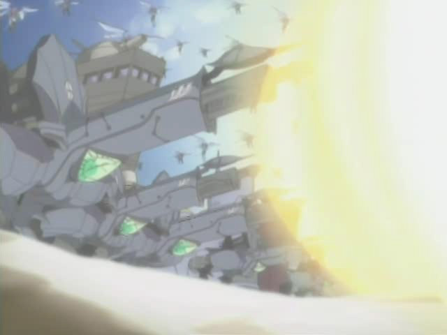 再來這邊很怪。那個光束應該是之後ナツキ被彈掉的那一擊吧?所以其實這是把ミユ潛水這段先往前放,然後再往前跳回發射陽電子炮(應該不是啦)的那段繼續演出?不管怎樣,更怪的是為啥水裡面竟然是風華學園?不是說人類是從其它星球移居到惑星エアル的嗎?那怎麼在水底會有風華學園?還有オーファン耶。