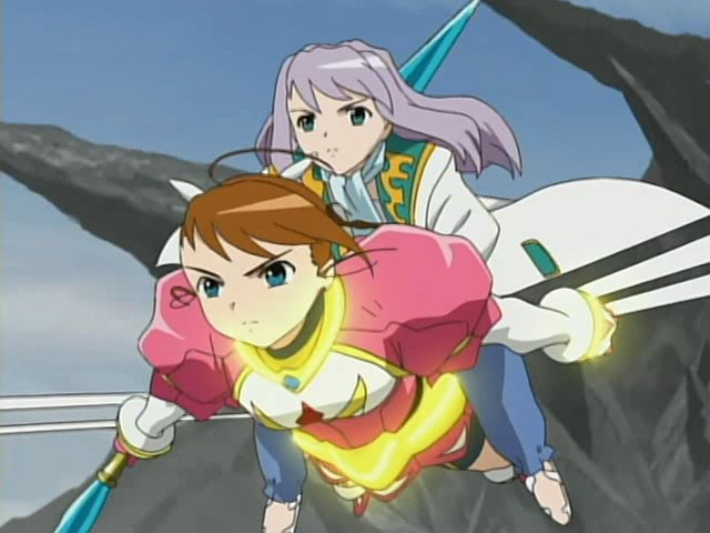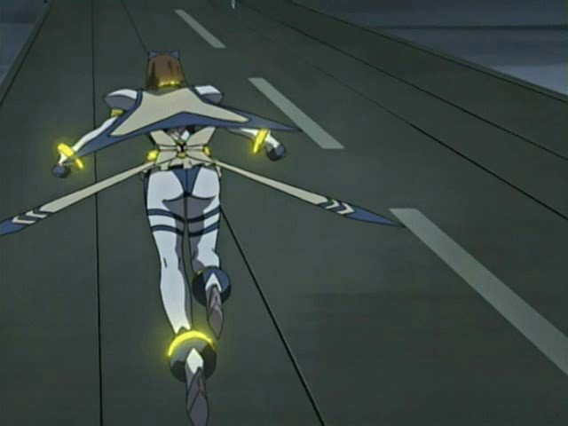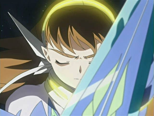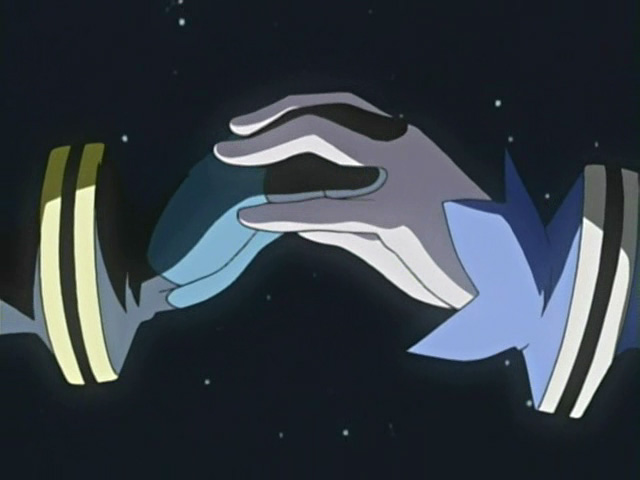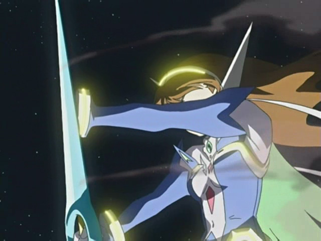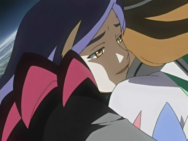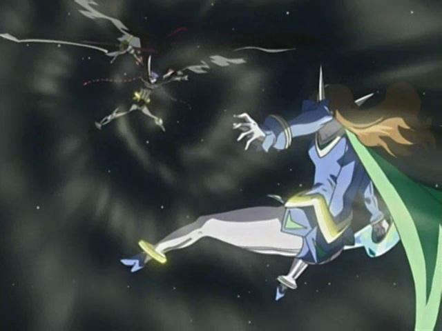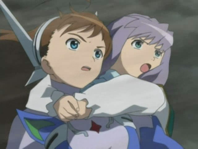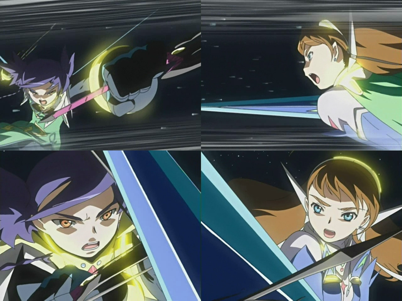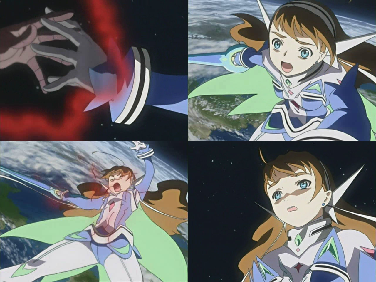 然後就是短戰的大氣圈內戰鬥,然後直接升上宇宙。這段的戰鬥步調掌握我覺得很好,用來表現兩個人實力不相上下剛剛好這樣;但其實重點是在於ニナ和アリカ的戶動上。心情這部份的描寫就沒有戰鬥那麼好做得好,只靠這些話其實很難說服我「ニナ被アリカ打動」這樣。不過手都握在一起了,那就算是心結解開了吧。 友情的力量,雖然沒有愛情那麼大,但通常正向力是很大的;愛情的話,則正負方向都有,要小心。