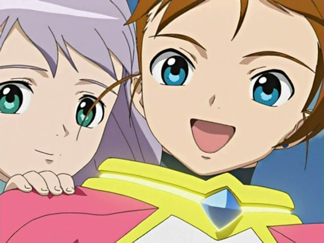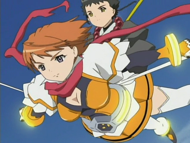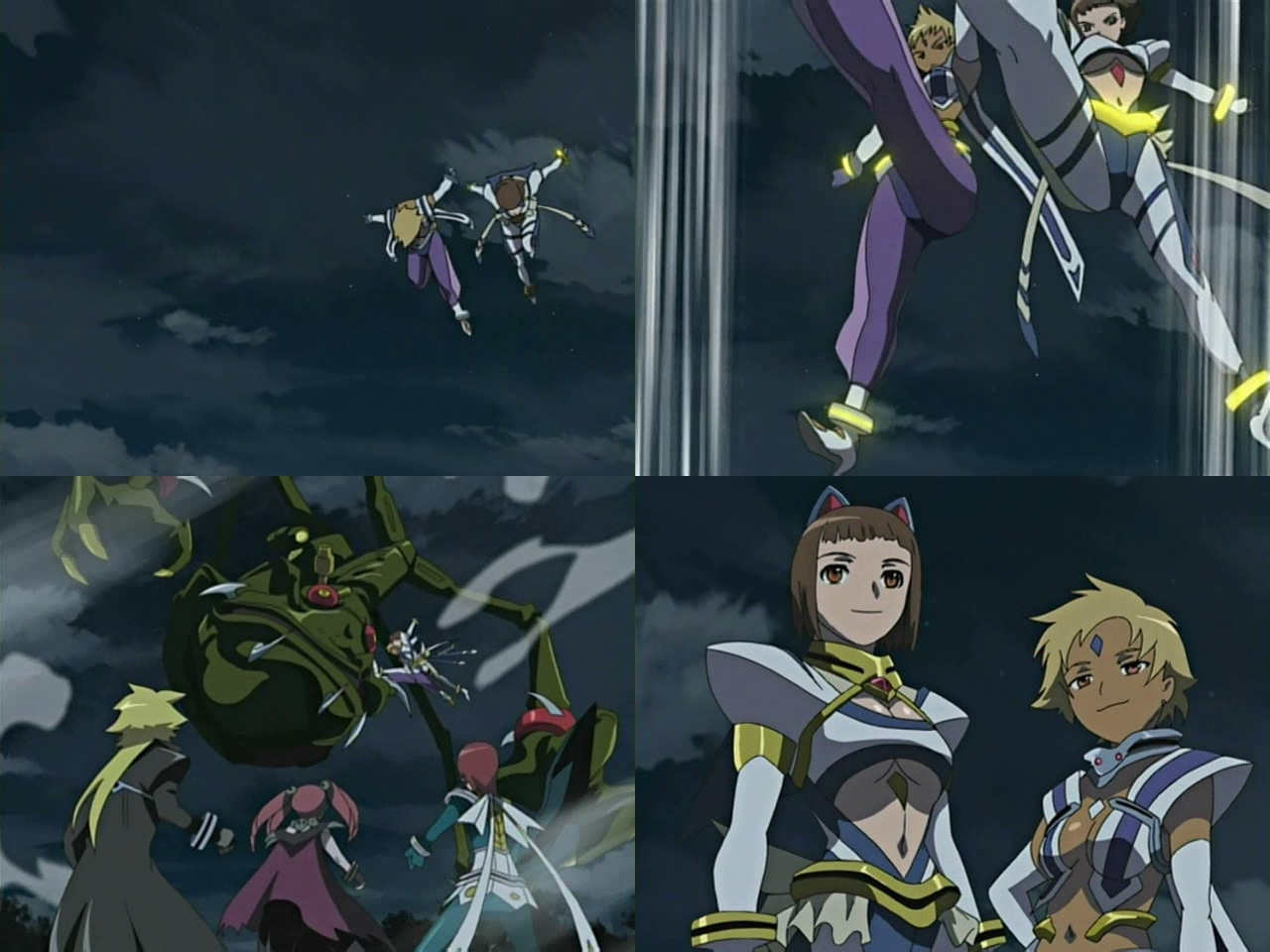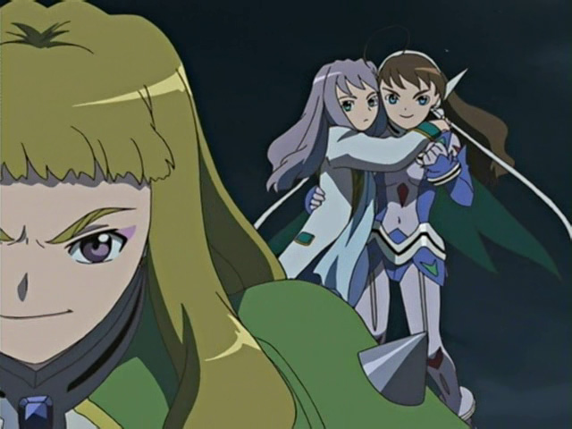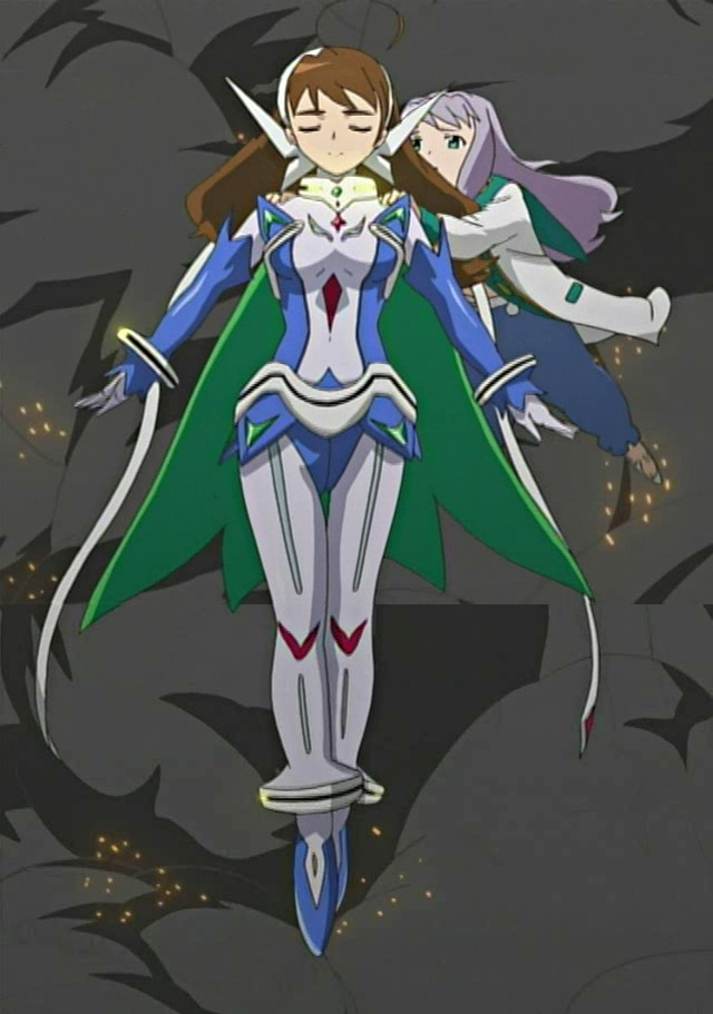 再來就是ハルモニウム的反撲,ニナ被附身變成Borg,長出了黑色翅膀,算是有點大魔王的樣子這樣。而被完全附身之前,ニナ叫アリカ要把她打倒,不然世界就完蛋了。聽著親友的呼喚,當然就要放大絕招回應大魔王了。 只是,Sunrise怎麼對「暁(あかつき)」這麼執著啊?連アリカ的大絕都要叫這個…。 大魔王果然就是要用對付大魔王那招;路人甲幹掉キラ大神那一招、命幹掉黎人那一招,看你要選哪一部作品,反正動作都差不多。但這次加上友情的力量,讓因為絕望而變成漆黑的金鋼石再次回到「眞白の金剛石」,也讓ハルモニウム解除對ニナ的控制。但這時候ニナ已經有點自暴自棄,所以直接推開アリカ想要自己做大氣圈突入吧? 友情的力量,就是讓兩個人可以全裸大氣圈突入;這太扯了好不好。完全是超級賽亞人等級以上了嘛。 然後是交代後事(真難聽,後日談就後日談),嗯。世界應該是在走向和平的路上,雖然還是走回了代理戰爭系統這樣。マシロ様和アスワド友好,她的城堡終於有了花;イリーナ升上了パール,恭喜恭喜。ミユさん可以放心的踏上旅程,アリカ的心中永遠有兩個最好的朋友,嗯。而ニナ,則是走向獨占父親大人的道路。最後那張三個人的合照,嗯,我差點流淚。