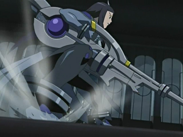 重裝版的ナツキ?其實沒有啦,還是扛著同一把陽電子炮(就說不是陽電子炮了)。可怕的是年輕版的ミス.マリア啊。整個人變年輕了,可是聲音還是一樣的「穩重」,違和感相當重。繼上一集的優雅近身格鬥之後,穿上了ローブ的「舞鬥」更是可怕。不愧是上一代的マイスター,訓練的程度完全不同。只是砍スレイブ還是會有血,不像其它人的武器打過去,スレイブ就直接粒子化這樣。