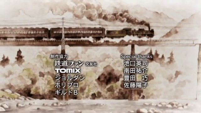 動畫「鉄子の旅」鉄子的動畫結束了,全13話,北海道到九州都有去過了。不過小弟最喜歡的還是ED「大いなる旅路」(大汗)。 ED總共八張圖,其中兩張是蒸汽機關車,另外應該都是車站和軌道的圖,JR/日本主要四島的最東西南北站都有,但另外有兩個就不知道是哪了,請知道的人提供一下答案,感謝。m(_ _)m 本篇的內容的話,嗯,有三話是講已經廢線的鐵道,有點讓人感傷。至於其它的內容,我覺得漫畫版比較好;至於整體的感覺來說,可能拍真人版會比較好,至少這樣不會覺得背景畫得很混這樣。只是以這種「旅遊」類(←算嗎??)的動畫來說,要把背景弄到好實在很難。而列車用3D模型來畫是可以接受,但請把toon shader給搞好,只靠貼texture是不夠的。 DVD小弟不推薦,主要是因為作畫的關係;但是配樂吸滴倒是可以考慮。小弟為了ED當然會買,但希望是全曲而不是只有動畫版的長度就是了。 では、ごきげんよう。 | |